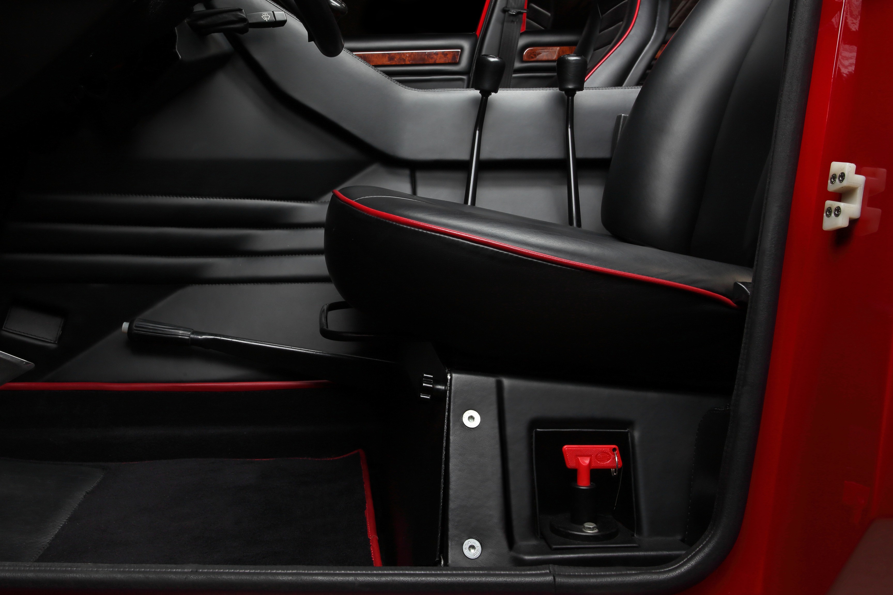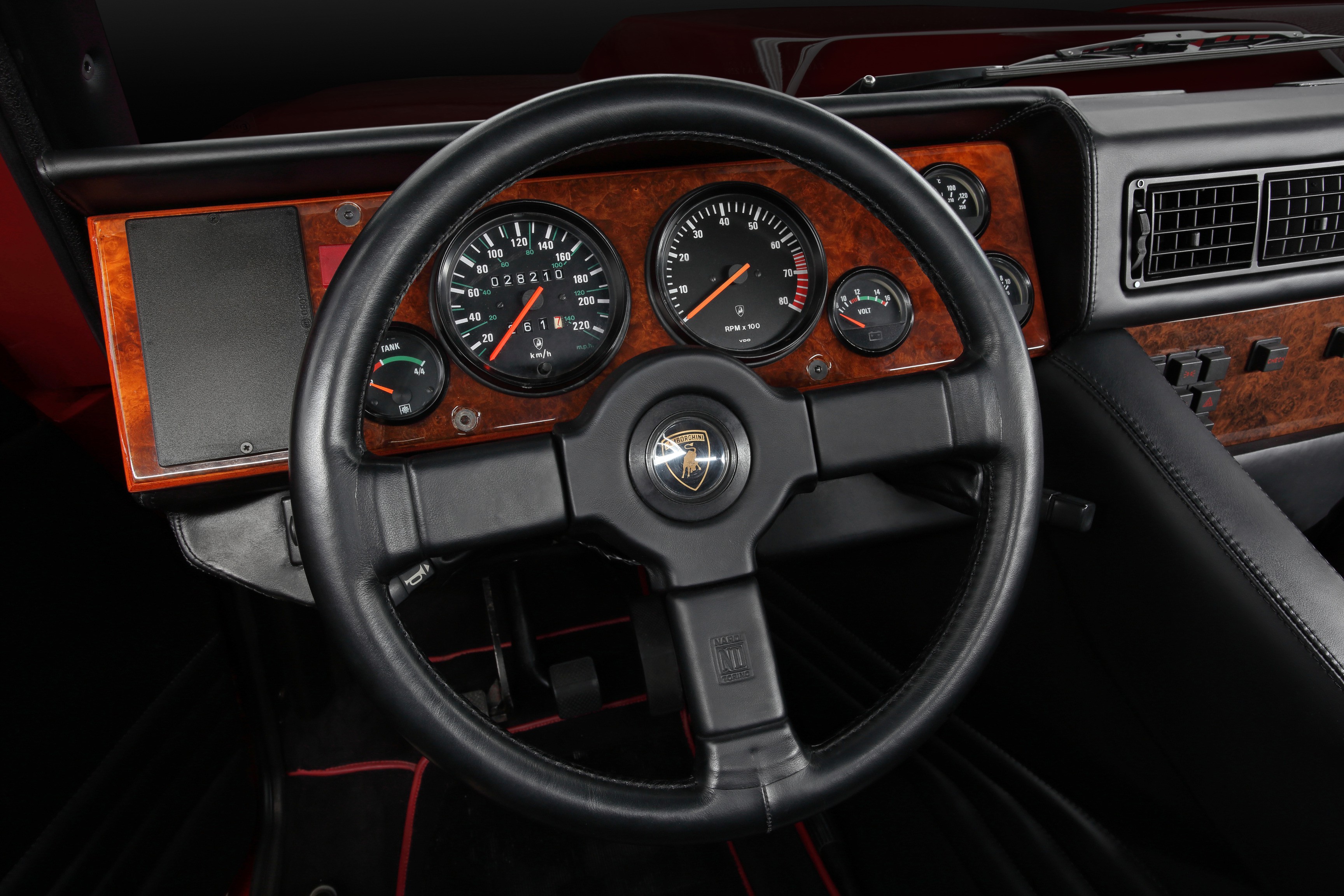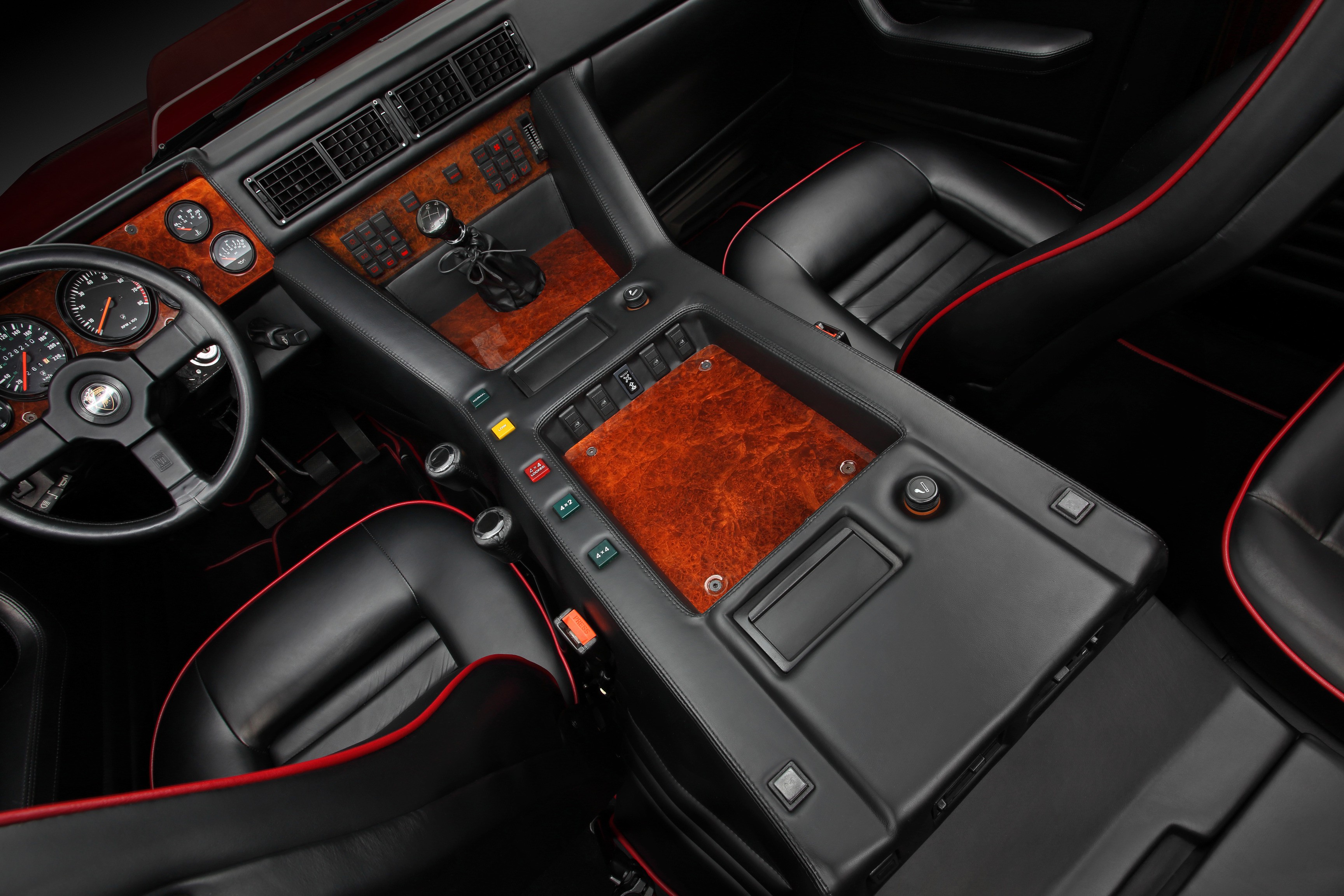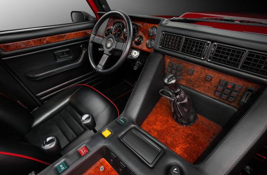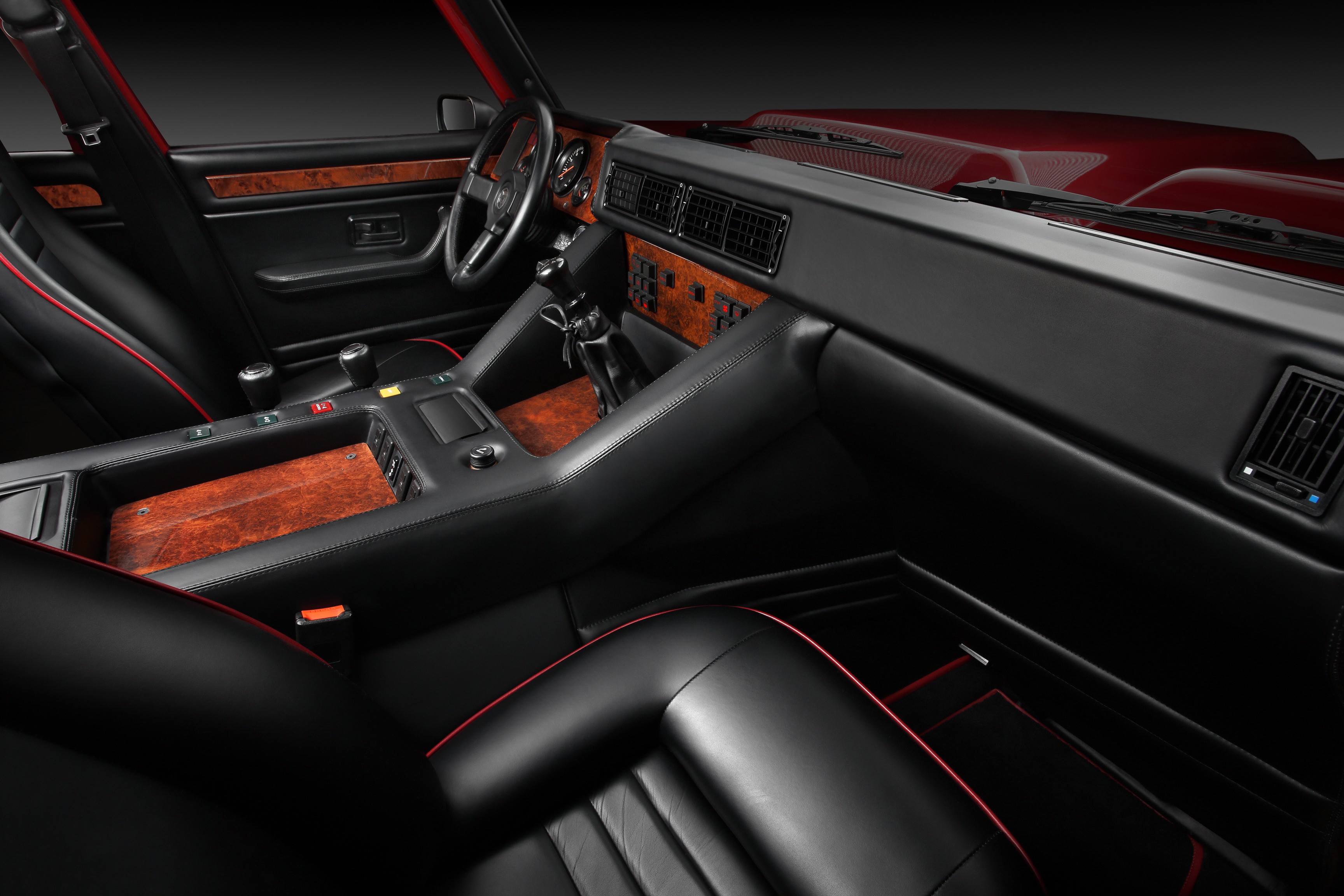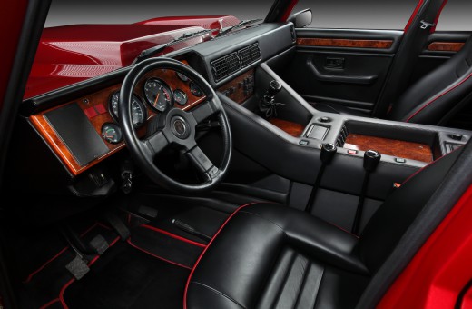 The interior, on the other hand, exuded luxury: full leather and wood trim, air conditioning, power windows, and a top-notch audio system in the ceiling. Luxury like in a Countach, but with four full-size seats.