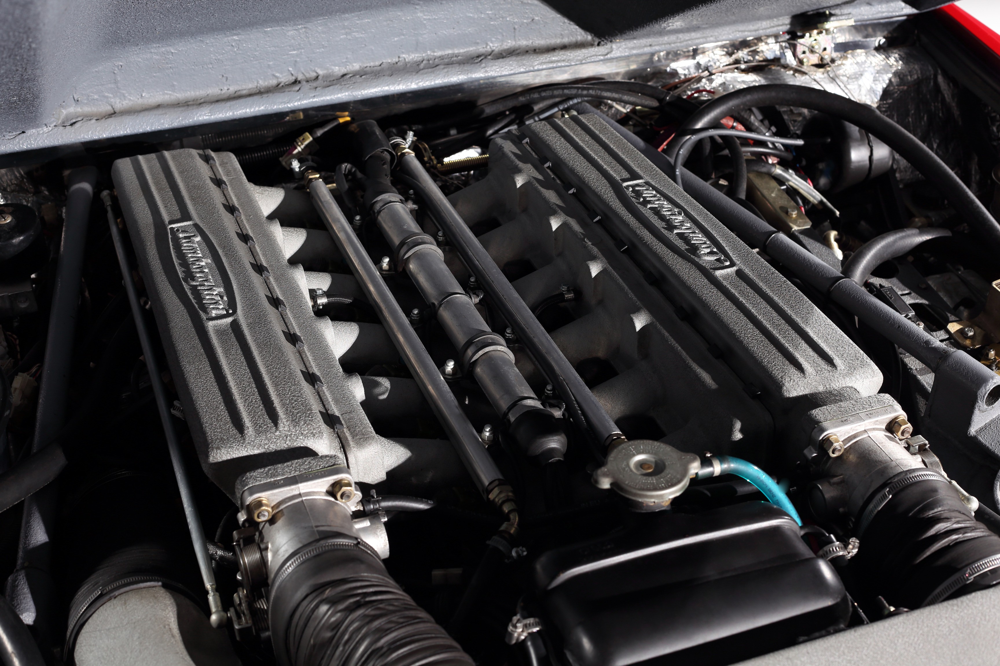 Engine: A 5.2-liter V12 (L503) straight from the Countach Quattrovalvole—450 hp and 500 Nm. The compression ratio was specifically lowered to allow for 94-octane gasoline (essential for desert conditions). There was an option—a 7.2-liter V12 from racing boats (even more power!). Later, a version with a 5.2-liter fuel-injected V12 (L503E) appeared—more precise fuel delivery, slightly higher power, improved throttle response, and slightly lower fuel consumption.